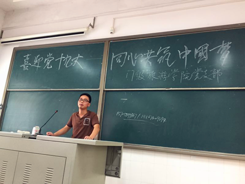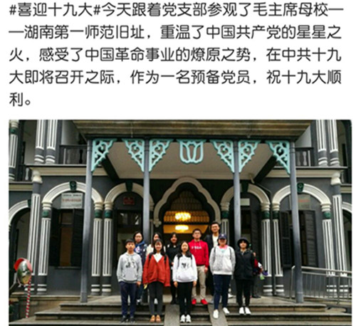 10月12日下午,酒店管理本科生党支部开展了“喜迎十九大,携手共奋进”主题活动,观一师范旧址,学习早期共产党员艰苦奋斗的精神,探讨了习近平总书记“年轻人,要立志做大事,不要做大官”对年轻人的意义。