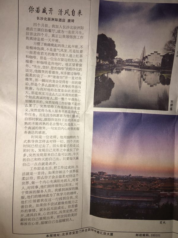 近日,从北辰洲际酒店传来喜讯,集团2014级实习生唐琦撰写的文章《你若盛开 清风自来》被该集团公司所属刊物《北辰报》刊载,并受到酒店高层领导和客人的表扬。