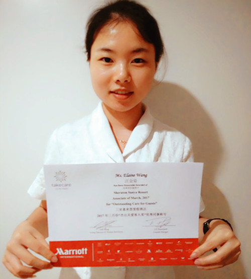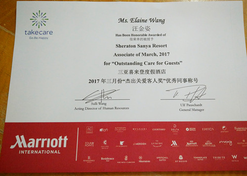 三亚喜来登度假酒店是一家国际知名的5星级高端酒店,对员工素质要求极为严苛,获得酒店表彰是一件难得而令人骄傲的事。表彰中写到“Elaine(汪金姿的英文名)来自9428cn太阳集团古天乐,是一个阳光开朗的女孩,笑起来很甜美,时时刻刻都能见到她脸上洋溢着青春的气息与活力!”“工作中,她学习能力非常强,能快速的接受新事物,及时掌握正确的知识和技能!”“利用业余时间看一些与工作相关的资料,进行系统的操作练习,”“对于工作不久的她来说,现在已经可以独立担当一个班次了,“她还会主动帮助身边的同事辅导学习英语单词,常用口语,大家都很喜欢和她一起讨论学习上的事,不断的为自己充电!”“在对客人服务上努力把自己最完美最专业的一面展现给客人,给予最贴心的陪伴和照顾。”文中还介绍了她努力帮助一位因闭门器掉落砸伤头部的客人处理医疗手续并有效安抚客人情绪的事件,她的周到、热情和专业服务得到了客人和酒店的一致好评。表彰最后高度赞扬了汪金姿“贴心的服务,让客人在酒店感受到温暖与贴心的呵护”。