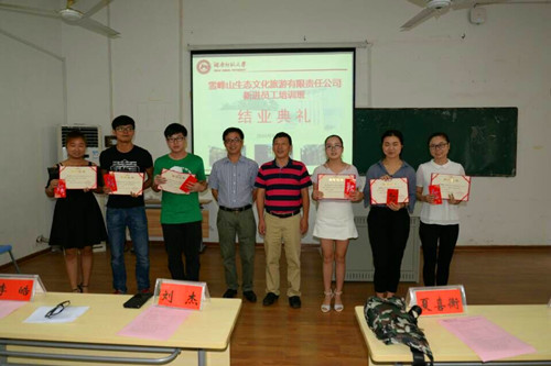 结业典礼上,夏喜衡代表雪峰山旅游公司对培训中被评为“优秀学员”者颁发证书和奖金,夏喜衡、李正益、刘杰、李皓分别为学员颁发结业证书。