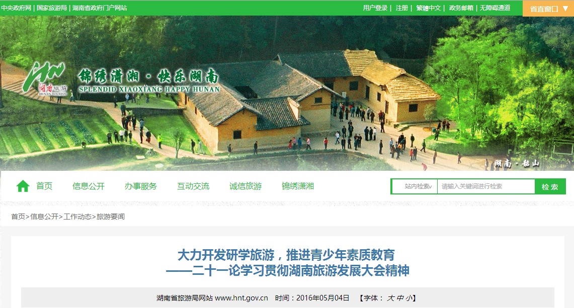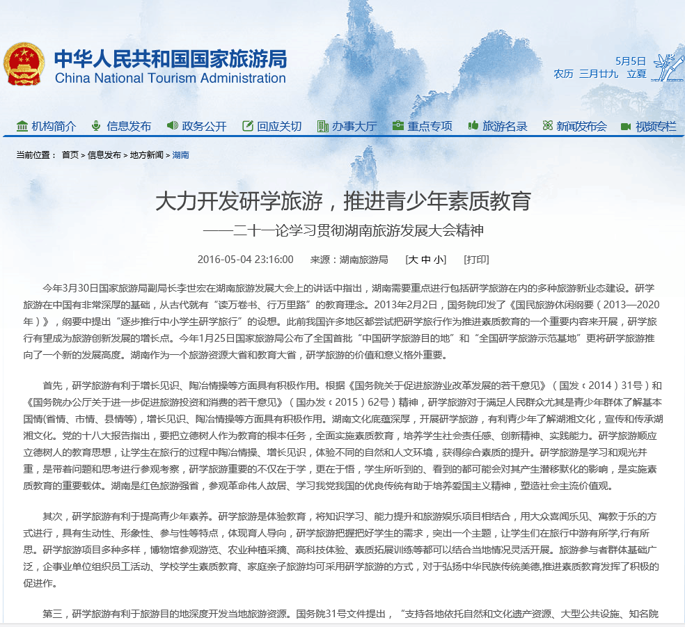 今年3月30日国家旅游局副局长李世宏在湖南旅游发展大会上的讲话中指出,湖南需要重点进行包括研学旅游在内的多种旅游新业态建设。研学旅游在中国有非常深厚的基础,从古代就有“读万卷书、行万里路”的教育理念。2013年2月2日,国务院印发了《国民旅游休闲纲要(2013—2020年)》,纲要中提出“逐步推行中小学生研学旅行”的设想。此前我国许多地区都尝试把研学旅行作为推进素质教育的一个重要内容来开展,研学旅行有望成为旅游创新发展的增长点。今年1月25日国家旅游局公布了全国首批“中国研学旅游目的地”和“全国研学旅游示范基地”更将研学旅游推向了一个新的发展高度。湖南作为一个旅游资源大省和教育大省,研学旅游的价值和意义格外重要。