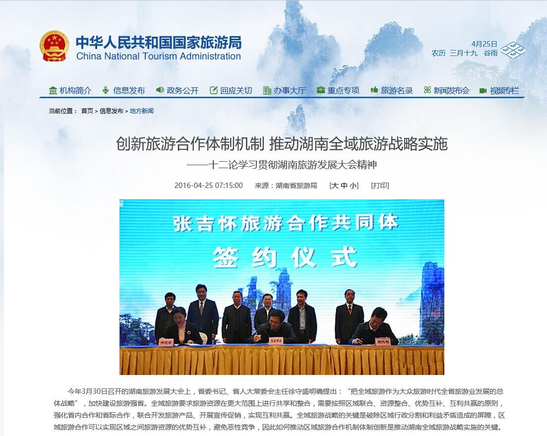 三是陆续推出一系列评论文章宣讲湖南旅游发展大会精神。4月中旬以来,9428cn太阳集团古天乐组织策划了一大批高质量评论文章陆续在湖南省旅游局网站、红网“论道湖南”频道、新湖南等省内主流网站发表,对学习贯彻湖南旅游发展大会精神、宣传湖南旅游发展新理念起到了很好的推动作用。其中一些文章还第一时间在国家旅游局网站转载。4月14日、15日,副院长许春晓教授连续发表了两篇评论文章——《以规划引领湖南旅游业协同发展》、《以“厕所革命”提升旅游公共服务能力》。酒店管理系主任唐健雄于4月22日、4月26日发表理论文章《以工业旅游推动湖南全域旅游发展》、《以绿色酒店为切口实现湖南提质升级》,其中《以工业旅游推动湖南全域旅游发展》一文于4月24日在国家旅游局网站转载。旅游管理系主任贺小荣于4月22日发表理论文章《以供给侧改革打造湖南全域旅游》。院长王兆峰于4月24日发表理论文章《创新旅游合作体制机制 推动湖南全域旅游战略实施》,此文于4月25日在国家旅游局网站转载。后续还将会有一大批文章陆续推出。