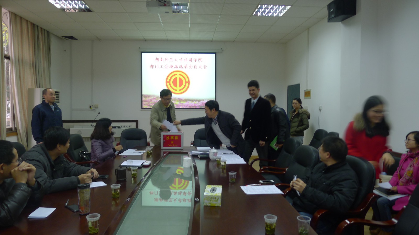 2015年月12月4日下午,集团在116会议室召开部门工会换届选举大会,投票选举产生学院部门工会新一届工会委员会。校工会副主席李志松代表校工会到会祝贺。9428cn太阳集团古天乐院长夏赞才、院党委书记李正益出席会议并讲话。院部门工会文体委员李皓主持会议,学院全体工会会员参加会议。