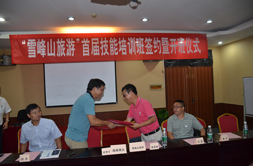 夏赞才表示,近年来学院积极加强校企合作共赢、服务地方经济社发展、进一步推进产学研一体化,这次签约是学院加强校企合作的又一重要成果。学院非常重视此次培训,根据学员情况及培训要求,从教学内容、形式和师资配备上都做了认真的准备。他勉励学员向老师学理论知识,学实践经验,学管理本领,并把学到的新理念、新知识、新技能大胆规范的应用到实际工作中去,做一名优秀的“雪峰山旅游人”。