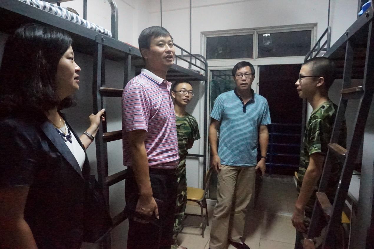 得知学院领导、老师来看望大家,同学们在教官的指导下提前将宿舍内务整理好以迎接到来。夏院长、廖书记、刘院长等逐一走访新生宿舍,亲切询问新生来校生活情况。“习不习惯这里的气候和环境?生活上有什么困难?宿舍的硬件设施是否齐全?宿舍是否存在安全隐患?”领导、老师们叮嘱新生尽快适应周围环境,投入到大学生活中去,有问题积极向辅导员老师反映,并鼓励他们认真学习,相互帮助,相互理解。