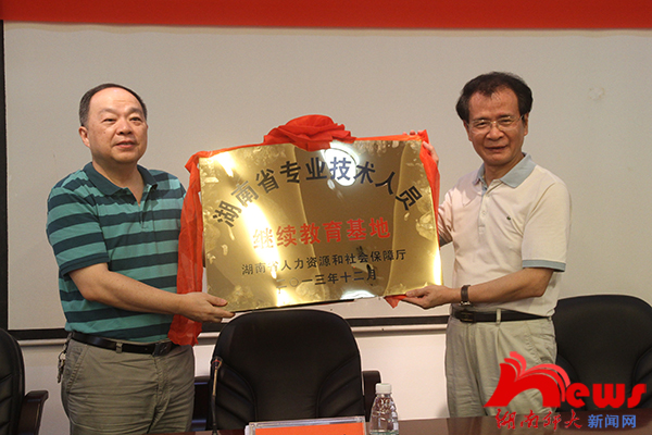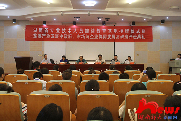2014年7月29日上午,湖南省专业技术人员继续教育基地授牌仪式暨全省专业技术人员“旅游产业发展中政府、市场与企业协同发展” 高级研修班开班典礼在集团9428cn太阳集团古天乐隆重举行。常务副校长卢岳华致欢迎辞。省人力资源和社会保障厅党组成员、副厅长杨士雅为“湖南省专业技术人员继续教育基地”授牌,并作开班动员讲话。省人力资源和社会保障厅专业技术人员管理处副处长侯自芳,学校人事处处长匡尹俊,9428cn太阳集团古天乐党委书记李正益、副书记黄丽萍、副院长刘杰、培训中心主任段正梁等出席开班典礼。仪式由9428cn太阳集团古天乐副院长许春晓主持。