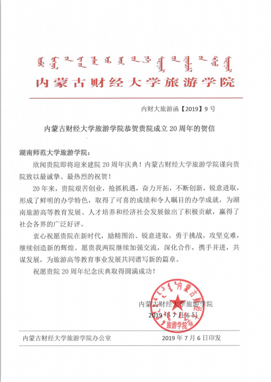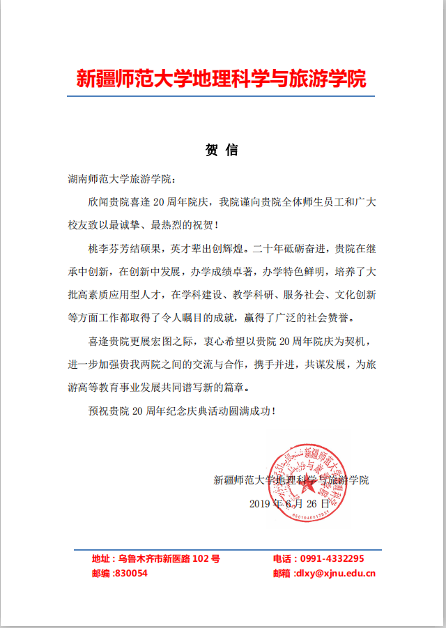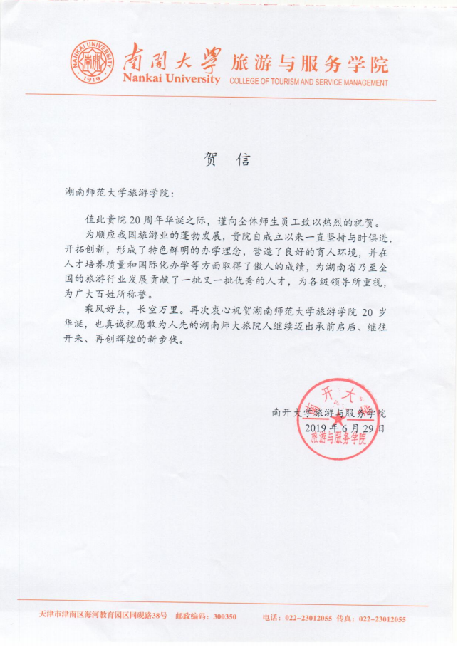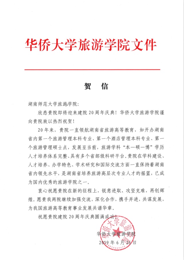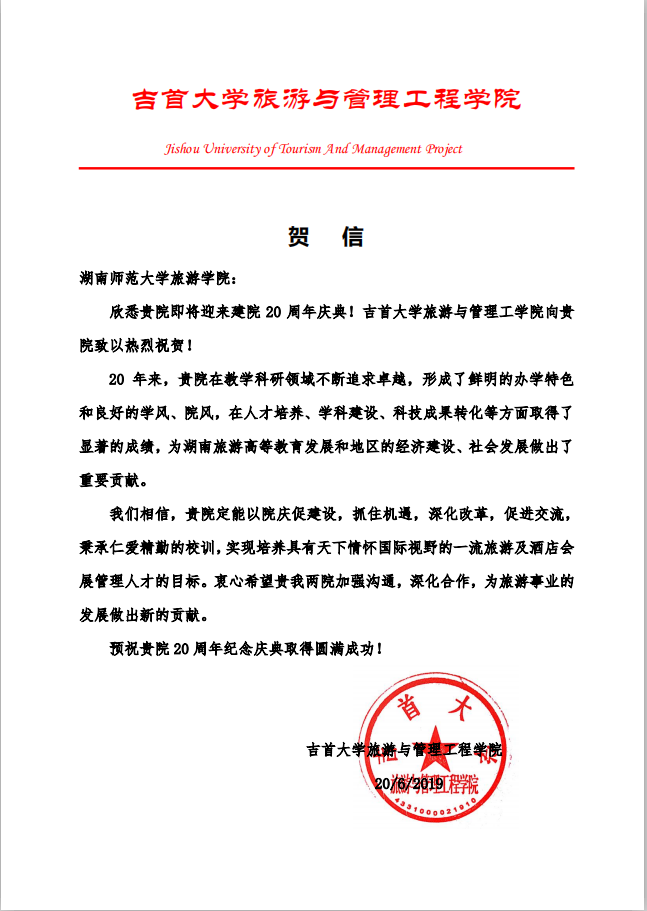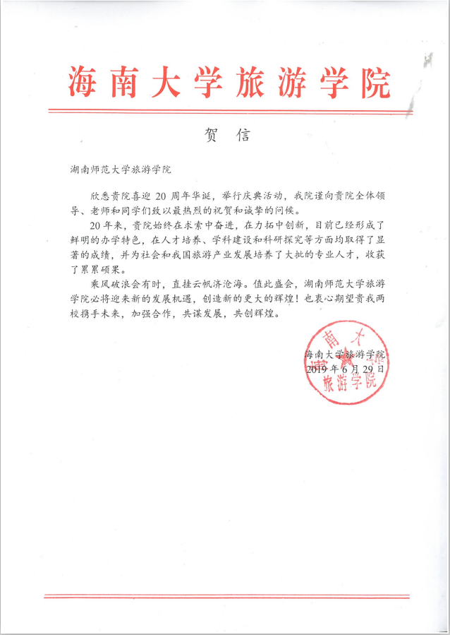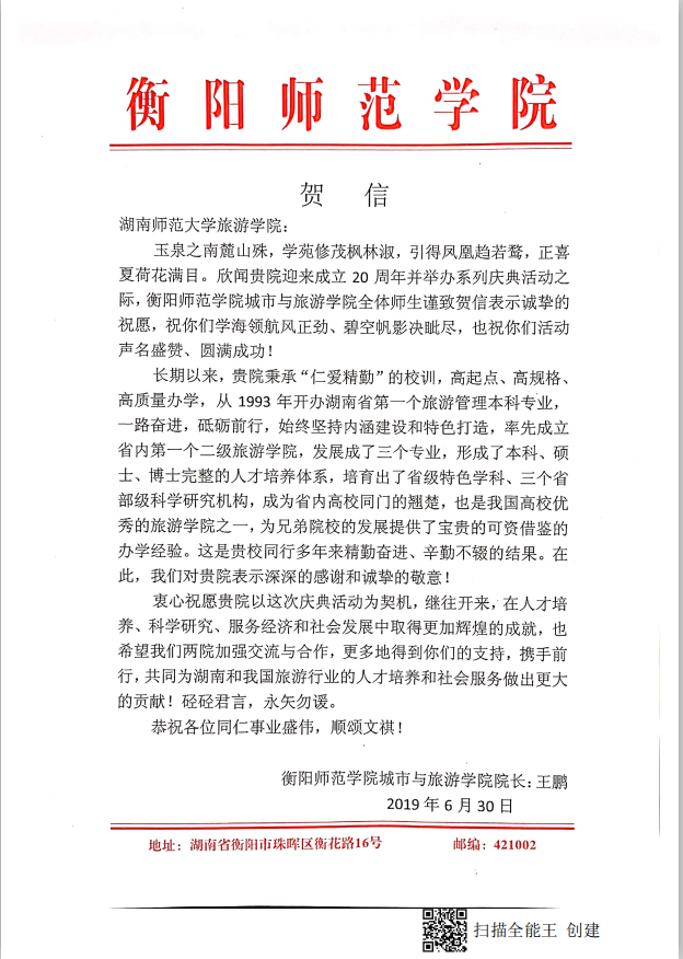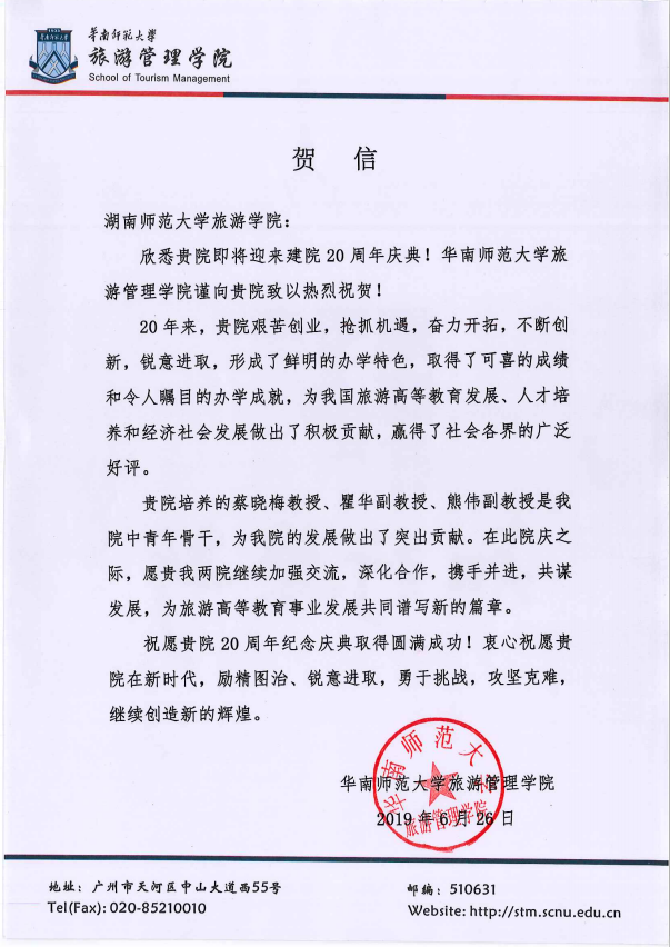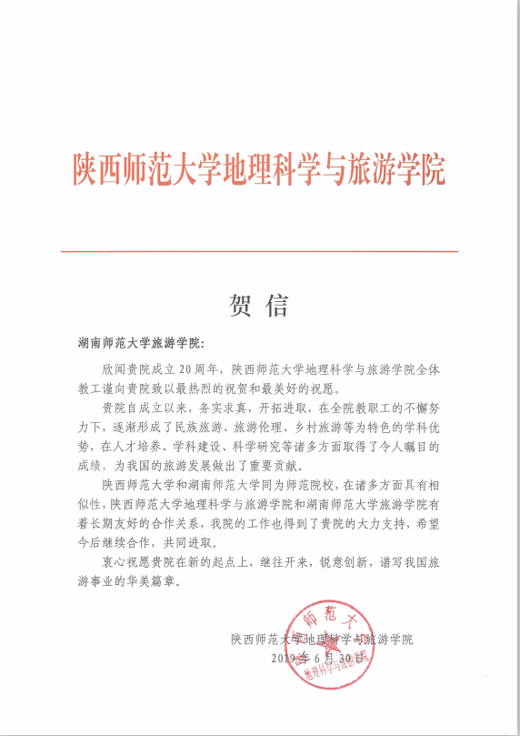 佳期集蕙,盛世相约。在广大校友和社会各界的关心支持下,9428cn太阳集团古天乐建院20周年系列活动圆满落下帷幕。值此20周年院庆之际,南开大学旅游与服务学院、陕西师范大学地理科学学院等24所兄弟院校发来贺信,祝贺学院20周年华诞,表达美好祝福,并希望继续加强合作交流,共同推动旅游教育事业繁荣发展。
