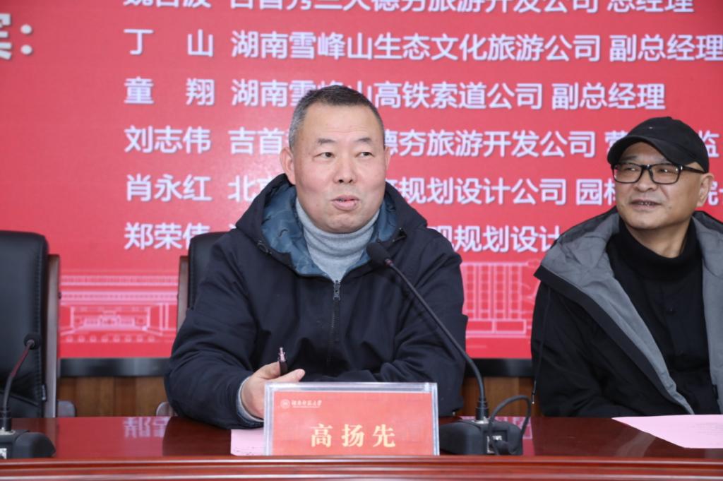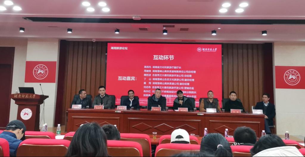 高扬先主持嘉宾与学生对话。吉首秀兰大德夯旅游开发公司总经理魏哲波、湖南雪峰山生态文化旅游公司副总经理丁山、湖南雪峰山高铁索道公司副总经理童翔、吉首秀兰大德夯公司营销总监刘志伟、北京世纪千府规划设计有限公司园林分院院长肖永红、深圳格林沃德景观规划设计有限公司设计总监郑荣伟、红网娄底站站长徐玲莉等职业经理人与集团师生围绕景区体验强化、区域旅游开发、文旅融合与文化保护、“互联网+旅游”、景区同质性开发问题、景区生命周期、民宿集群发展、雪峰山旅游案例打造等方面展开互动对话。
