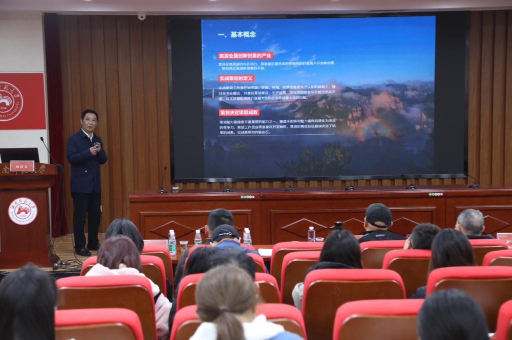 (通讯员 黄美艳 陈益)2019年12月1日下午,集团举办的“湖湘旅游论坛·文旅产业前沿”学术讲座在中和讲堂举行。湖南省文化和旅游厅高扬先副厅长出席活动,湖南雪峰山高铁索道公司总经理周建良先生作主题报告。集团院长王兆峰教授、副院长贺小荣教授、旅游研究所所长徐飞雄教授等参加了论坛。论坛由旅游管理系郑群明教授主持。