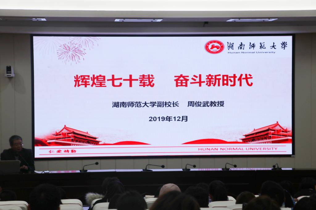 周俊武以«辉煌七十载,奋斗新时代»主题,从“沧桑巨变七十年”,“砥砺奋进、谱写壮丽史诗”,“深刻启示、引领前行之路”,“奋勇拼搏、开创崭新征程”四大部分展开论述,详细阐述了新中国成立以来的政治变革,国家的经济改革和工业化建设成就,重大军事战役经验及新中国军事力量的逐渐强大,新中国科学技术的快速发展和科研人员不断奋斗勇攀高峰的精神。他表示,新时代中国的不断进步和发展,人民生活水平不断改善,国际地位空前提高,都离不开奋斗二字,当代大学生要有远大抱负,保持奋斗精神和爱国热忱,成为一个合格社会主义事业建设者和接班人,为实现中华民族的伟大复兴贡献力量。