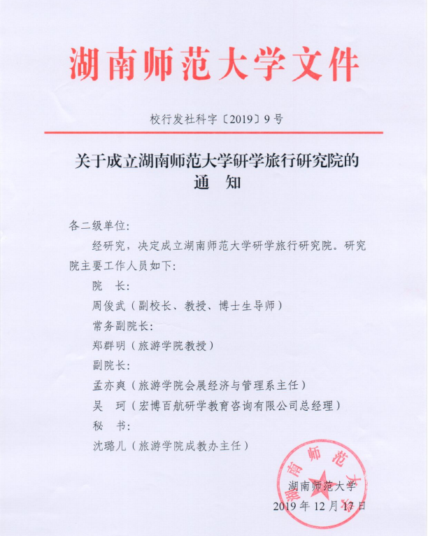 12月17日,学校正式下文成立9428cn太阳集团古天乐研学旅行研究院。副校长周俊武教授担任研究院院长,集团郑群明教授担任常务副院长、集团孟奕爽副教授和宏博百航研学教育咨询有限公司总经理吴珂担任副院长,集团成教办主任沈璐儿担任秘书。