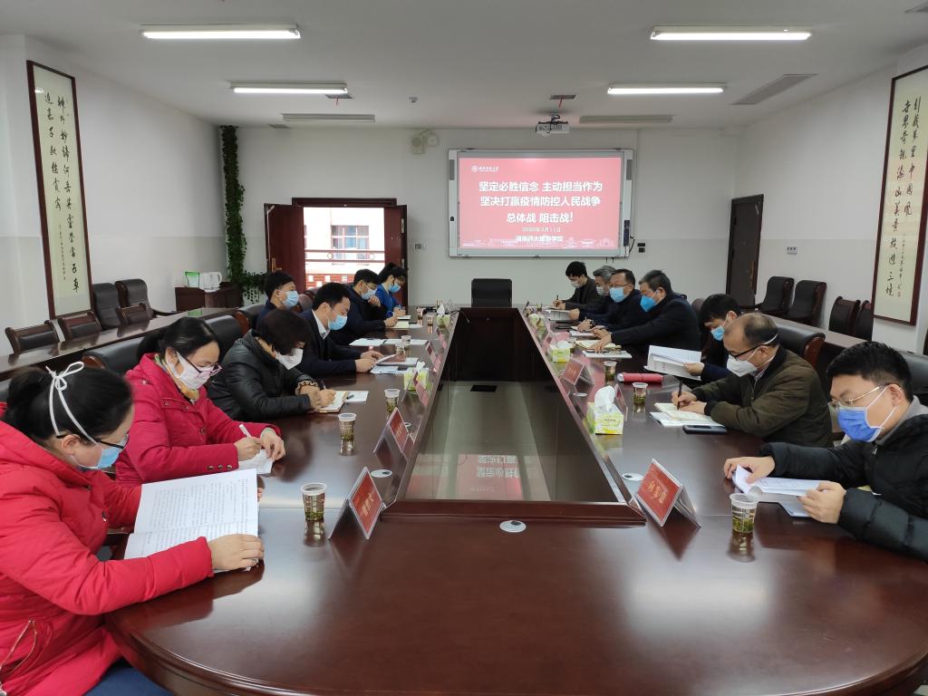 会上,王兆峰院长和鲁良书记从学院严格按照学校部署落实各项防控任务”、通过线上平台确保特殊时期组织生活不断档、精细管理确保实习生的安全管理与有序撤离、实施“相互关爱”行动把关心关爱做到位、实施“3+1”线上教学模式做好新学期教学工作等方面汇报了学院疫情防控工作情况,介绍了下一阶段学院防控工作面临的问题和挑战。