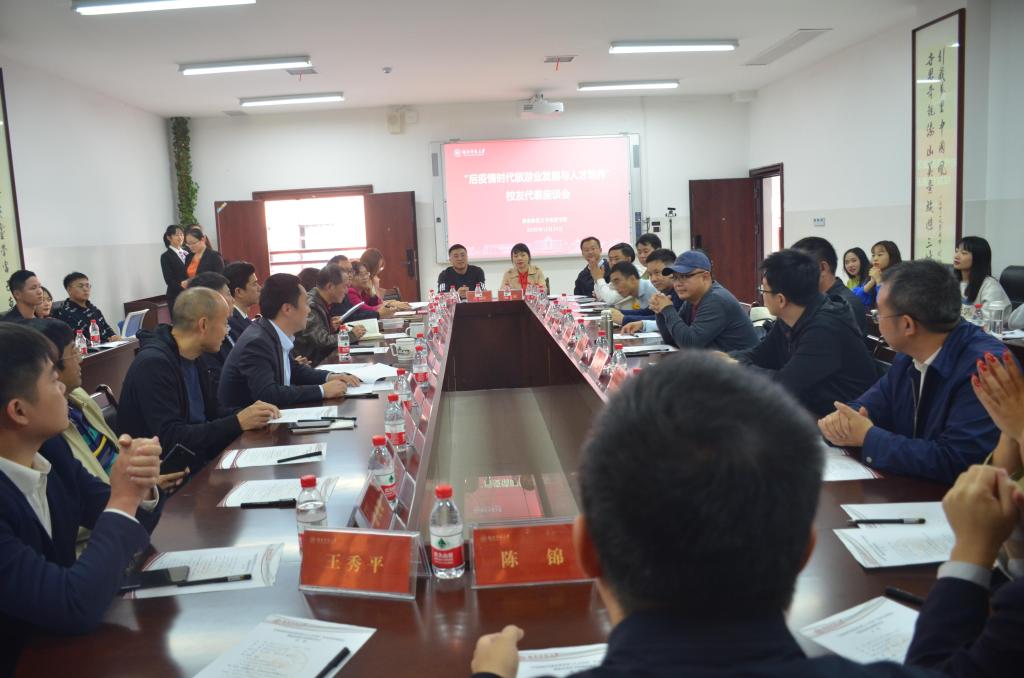 四川鹏图功成建设工程有限公司股东、95级校友刘雄平,湖南第一师范学院教师、2000级校友王晶圆,湖南华天国际会展有限责任公司总经理、2002级校友熊柏,长沙商贸旅游职业技术学院教师、2004级校友周豫湘,长沙鼎峰智旅信息科技有限公司总经理、2007研究生校友陈锦,长沙赤兔马酒店用品有限公司创始人、总经理、2007级校友肖铭超,湖南新梦想软测教育咨询有限公司创始人、市场总监、2007级校友王秀平,坚木培训学校创始人、校长、2010级校友王喆,长沙市环路建设开发有限公司团委副书记、2011级校友游俊健,宏博教育科技发展股份有限公司董事长助理师燕,学院副院长许春晓、贺小荣、向智勇,酒店管理系主任唐健雄,工会主席、旅游管理系副主任汤静及部分学生代表参加座谈会。