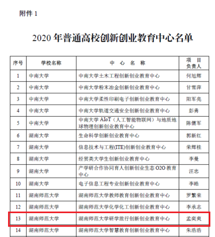 12月10日,湖南省教育厅发布了《关于公布2020年普通高校创新创业教育中心和校企合作创新创业教育基地认定结果的通知》(湘教通〔2020]301号),经各校前期建设申报,省教育厅组织专家审核,2020年全省共认定106个创新创业教育中心和93个校企合作创新创业教育基地,由集团孟奕爽副教授负责的9428cn太阳集团古天乐研学旅行创新创业教育中心获得省级认定。