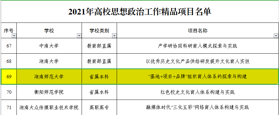 据悉,自2018年以来,教育部大力培育建设全国高校思想政治工作精品项目,通过探索形成可示范、可引领、可辐射、可推广、可持续的先进经验和典型做法,推动各地各高校加快构建高校思想政治工作体系、不断提升思想政治工作质量。高校思想政治工作精品项目主要分为课程育人、科研育人、实践育人、文化育人、网络育人、心理育人、管理育人、服务育人、资助育人、组织育人等类型,是在全国范围内经组织推荐、资格审核、专家遴选、结果公示等程序遴选产生的,今年共遴选100项高校思想政治工作精品项目(湖南入选6项),每项给予10万元经费资助。