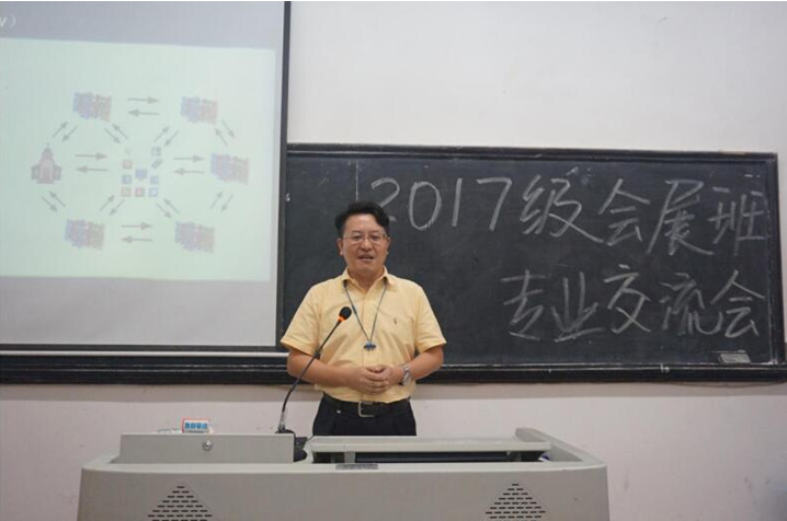 会展业是产业发展的“晴雨表”和“助推器”,对城市经济有1:9的拉动效应,是促进产业经济和地域文化发展的重要平台,有利于构建现代市场体系和开放型经济体系,打造区域文化软实力。国务院于2015年专门出台了《关于进一步促进展览业改革发展的若干意见》》(国发〔2015〕15号)。孟老师从会展业的内涵、会展专业的特点与培养方案、会展管理系师资情况和会展专业学习方法四个方面进行了系统介绍。他深入简出的向2017级会展专业新生讲解了该专业的特点、优势、未来的就业方向,鼓励同学们进行职业生涯规划,充分利用大学四年宝贵的时间积极求学,争取本科毕业后继续考研深造,不断更新自己的认知,迎接未来新的挑战。