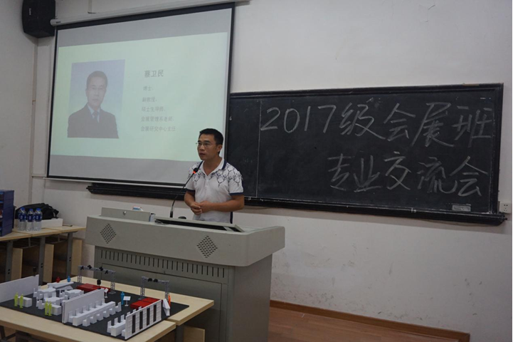 (通讯员 李鑫泽 刘竹滢)9月15日晚,集团会展管理系于112教室举办会展经济与管理专业2017级新生专业教育。会展管理系负责人孟奕爽博士、会展研究中心主任蔡卫民副教授、会展专业教师胡兵博士出席,2017级会展经济与管理专业新生和2016级部分优秀学生代表参加。专业教育在一段激动人心的视频中正式拉开帷幕,主要内容分三部分:教师介绍专业、2016级学生分享学习经验和会展沙盘模拟。